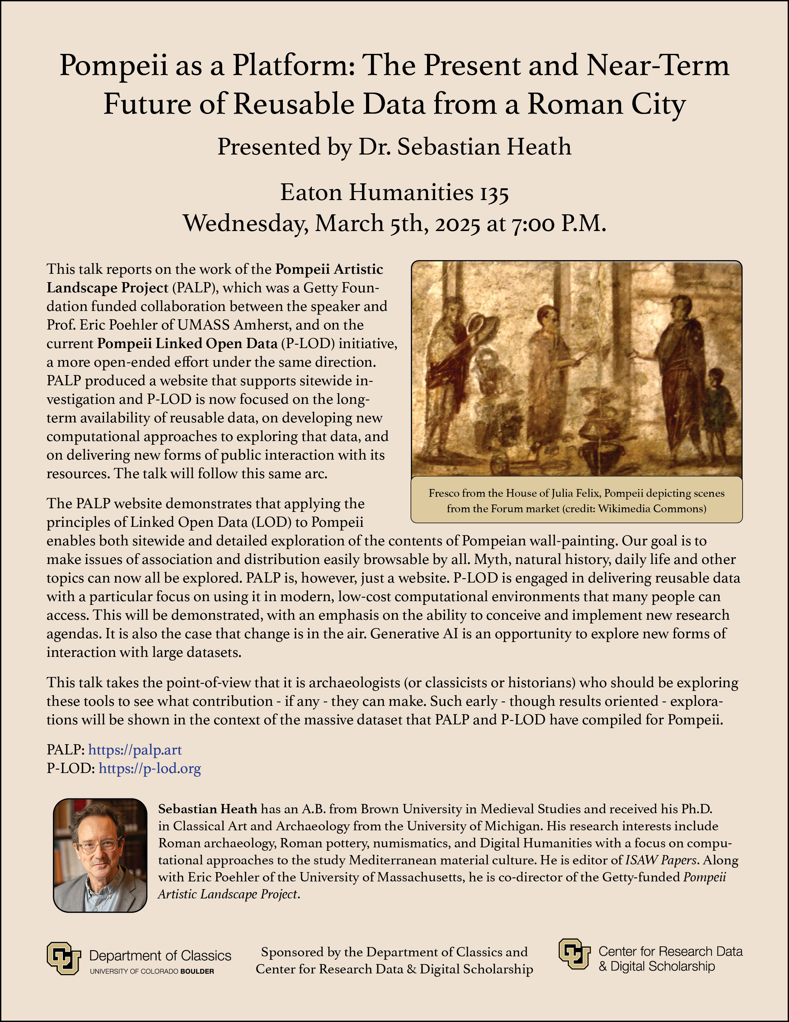 ABSTRACT: This talk reports on the work of the Pompeii Artistic Landscape Project (PALP), which was a Getty Foundation funded collaboration between the speaker and Prof. Eric Poehler of UMASS Amherst, and on the current Pompeii Linked Open Data (P-LOD) initiative, a more open-ended effort under the same direction. PALP produced a website that supports sitewide investigation and P-LOD is now focused on the long-term availability of reusable data, on developing new computational approaches to exploring that data, and on delivering new forms of public interaction with its resources. The talk will follow this same arc.