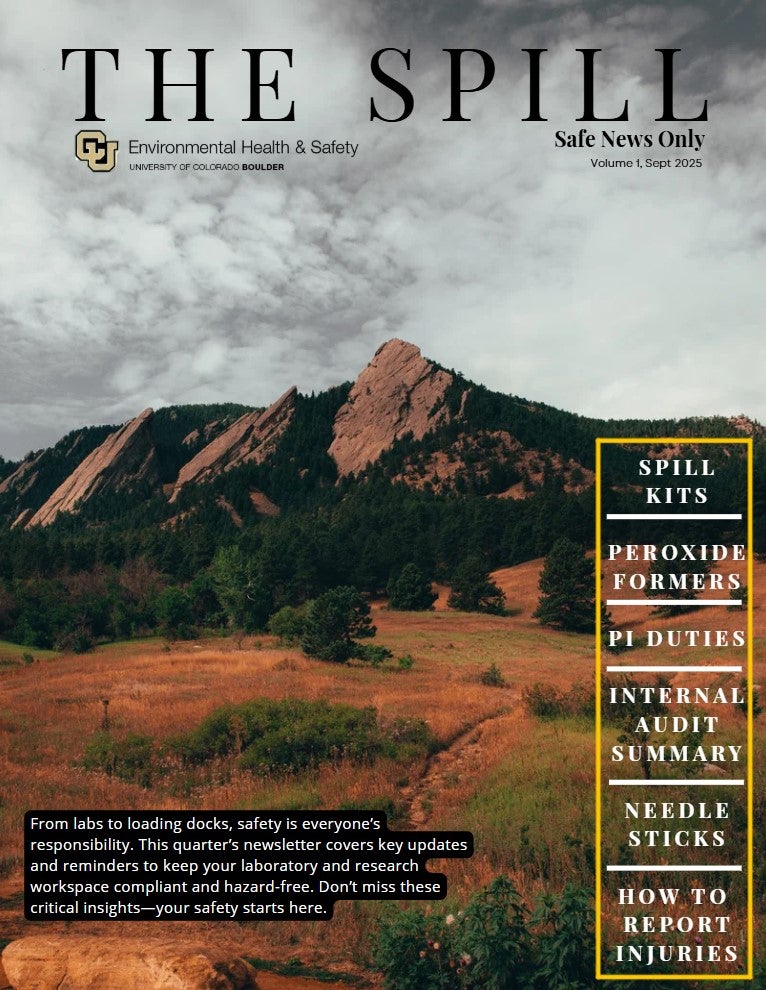Laboratory & Research SafetyLaboratory & Research Safety Contact EH&S for Laboratory & Research Safety Support Call 303-492-6025Email ehs@colorado.eduCheck out the EH&S quarterly newsletter! "The Spill - Safe News Only"General Laboratory SafetyAnimal ResearchBiological SafetyChemical SafetyHazardous WasteLaser SafetyRadiation SafetyField ResearchTrainingGuidance DocumentsEH&S Quick LinksReport an InjurySubmit a ConcernSciShieldRequest a Project Inspection Request a Waste Pick-upNew Researcher?Departing Researcher?