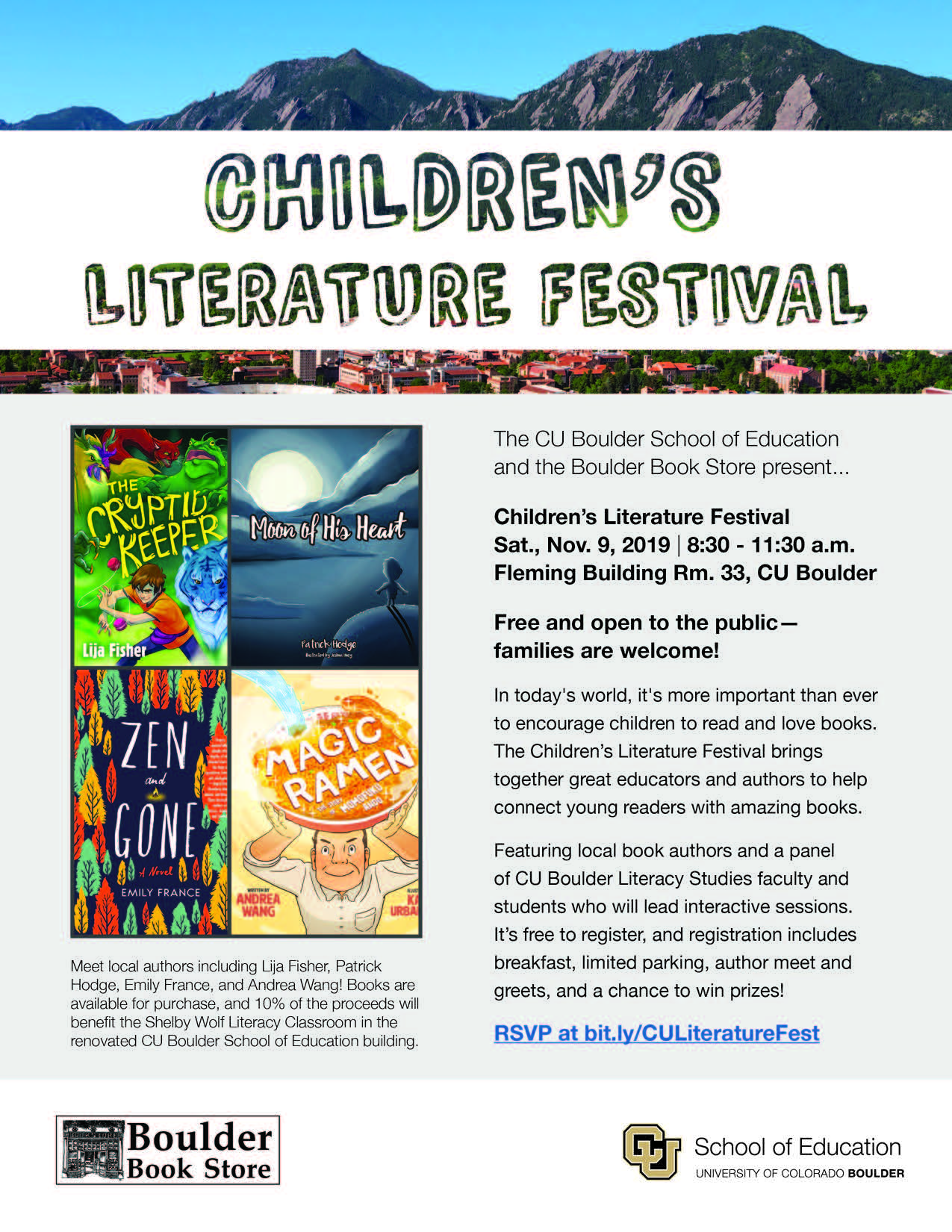 2023 Children's Book Festival5th Annual Children's Book Festival | Oct. 25-27, 2023 The CU Boulder School of Education and the Boulder Bookstore invite teachers, students, families, librarians, and all who enjoy children’s literature to join us for the following free events! Highlights include: