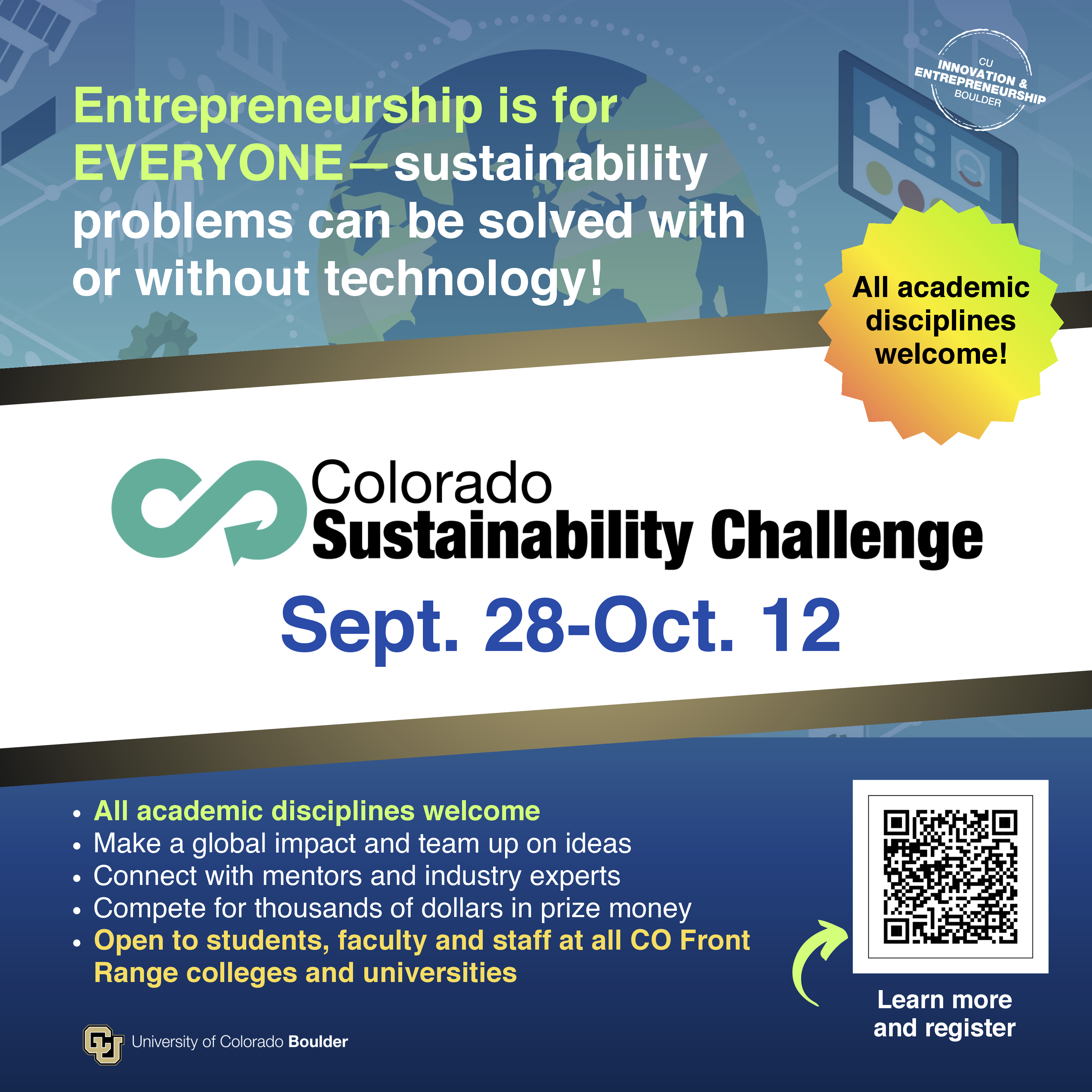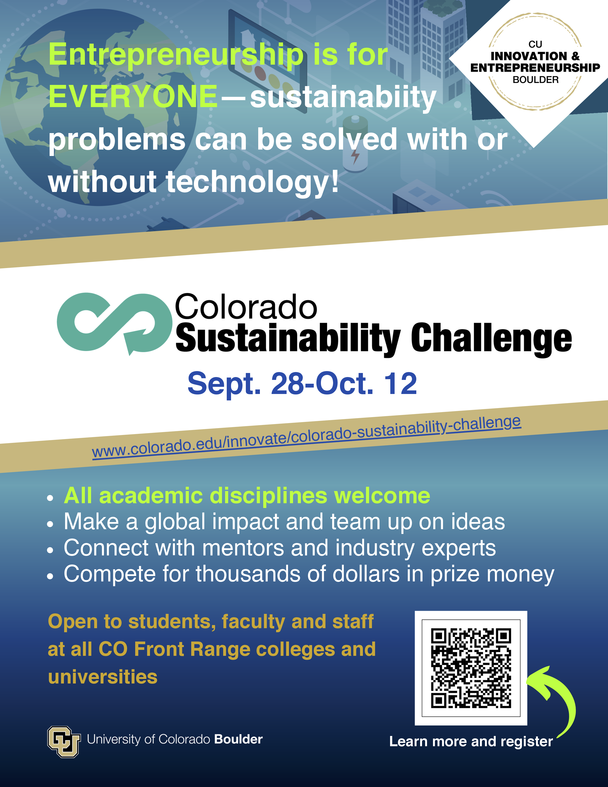 Join us for the statewide 2025 Colorado Sustainability Challenge (CSC), a two-week collaborative event designed for anyone passionate about solving problems, teaming up on an idea and having fun in the process of building a solution to impact sustainability. Participants come from all academic disciplines—ranging from the Humanities to STEM—and have a shot at winning a share of $17,000!