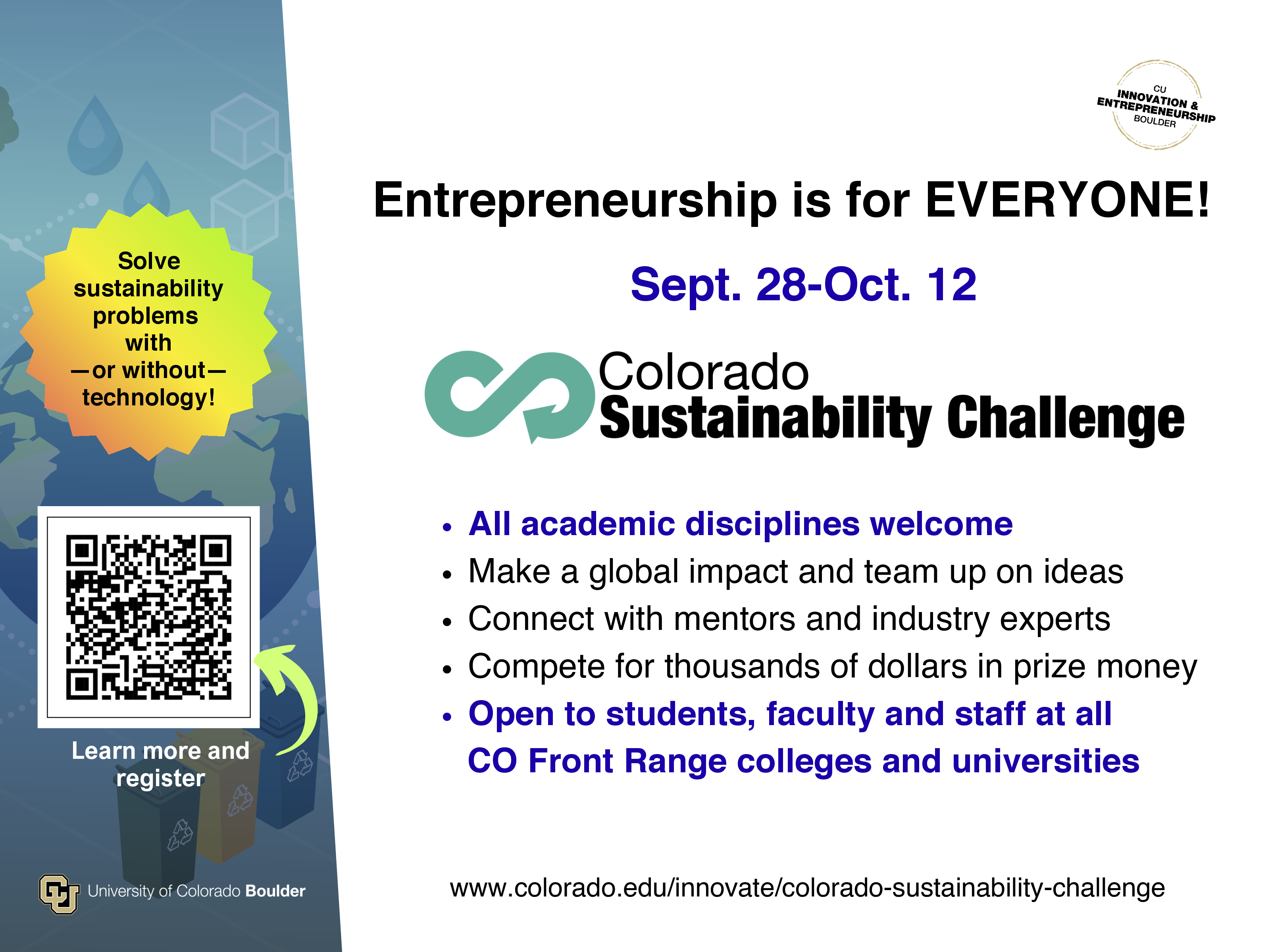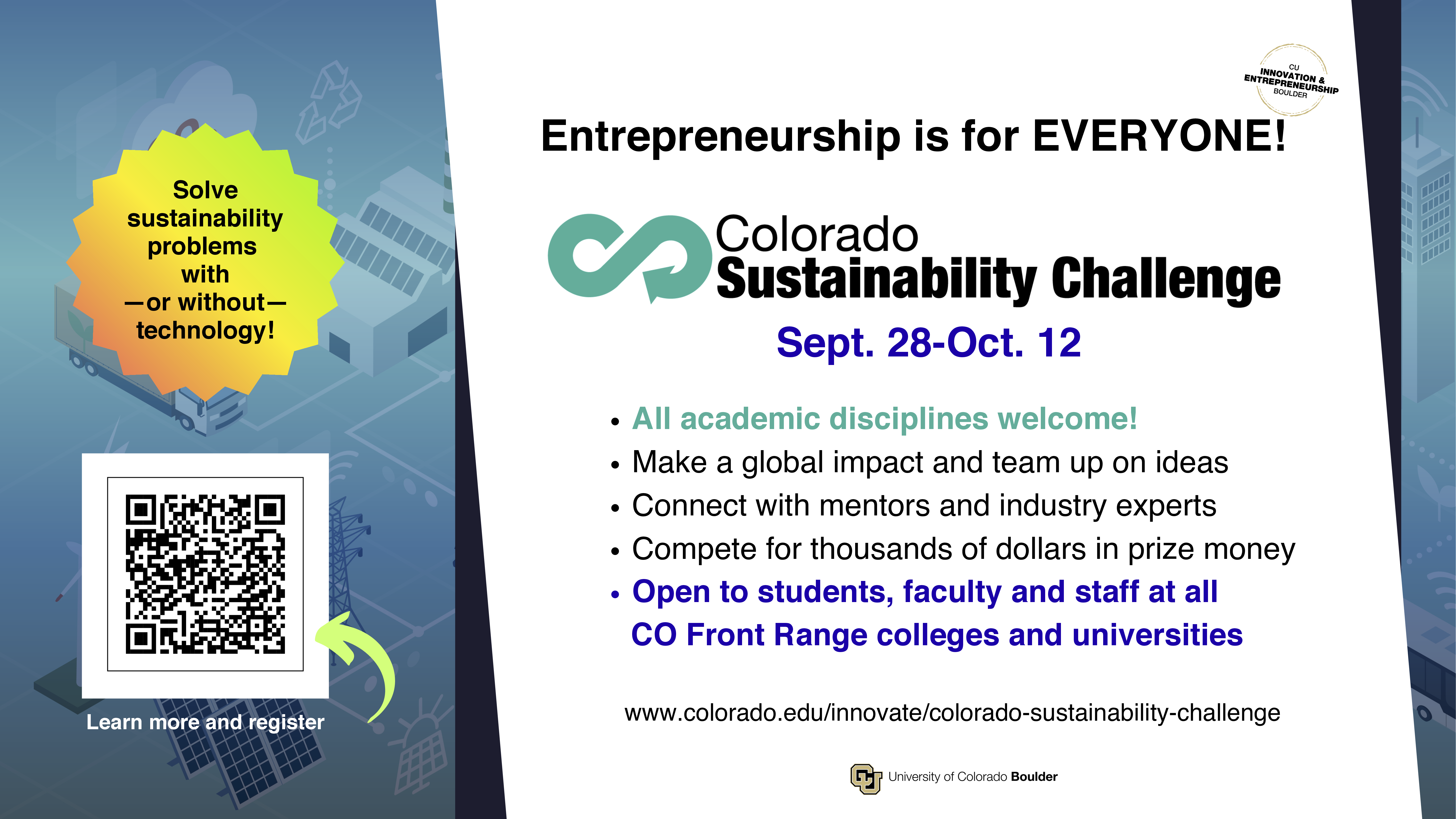 This page contains all the information available to help you promote this opportunity to your network and community. For Affiliate Contacts: If you have questions or suggestions, please reach out to Karen Reid, marketing and communications specialist for the Innovation & Entrepreneurship Initiative at karen.reid@colorado.edu.