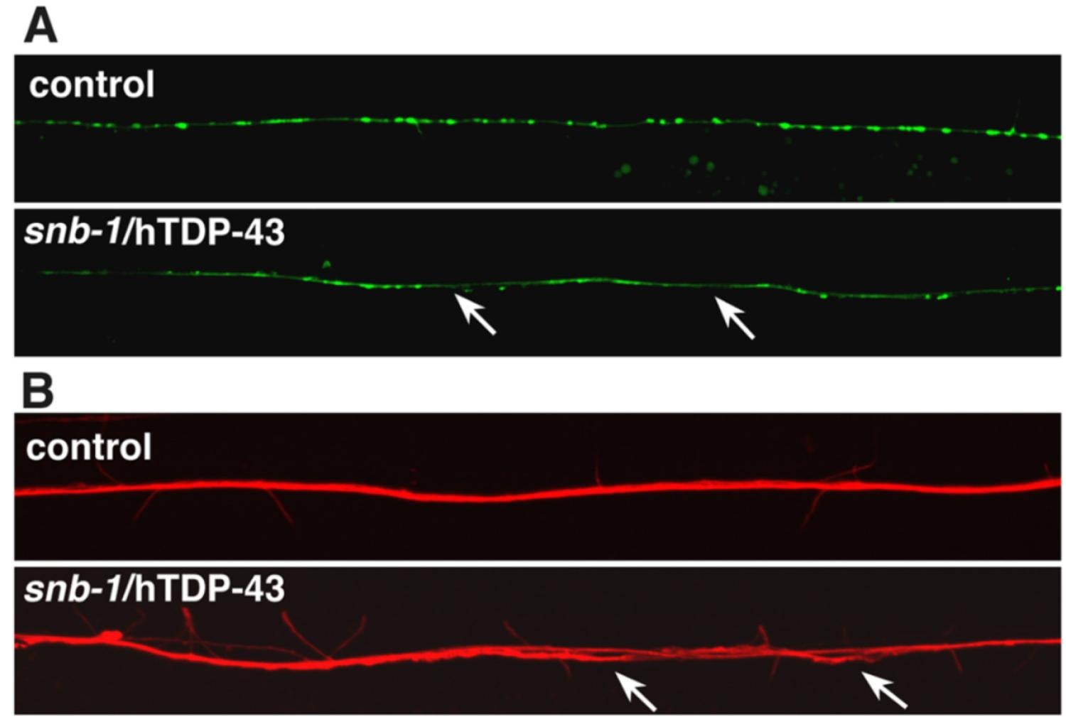 Expression of human TDP-43 in C. elegans neurons interferes with normal motor neuron synapses (green. panel A) and defasiculation of the dorsal nerve cord (red, panel B). From Ash et al, 2010