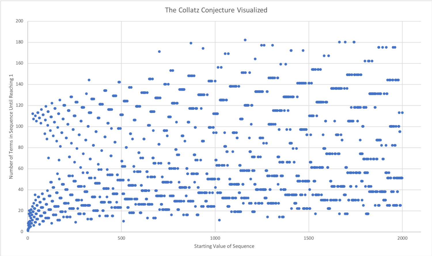 Description: Take any positive integer. If it is even, divide it by 2. If it is odd, multiply it by 3 and add 1. This produces a new positive integer. Repeat this process, producing a sequence of positive integers. Does this sequence eventually reach the number 1? The Collatz Conjecture, which is also known as the 3n+1 Problem, states that the sequence produced by every positive integer eventually reaches the number 1. This has been an open question since at least 1937, when it was first formally stated. We will look at the numerical evidence supporting the conjecture and investigate some of the fascinating properties connected to it. We will use a variety of technological tools to help our exploration, including Microsoft Excel and other software packages/programming languages, and the Online Encyclopedia of Integer Sequences (oeis.org) website.